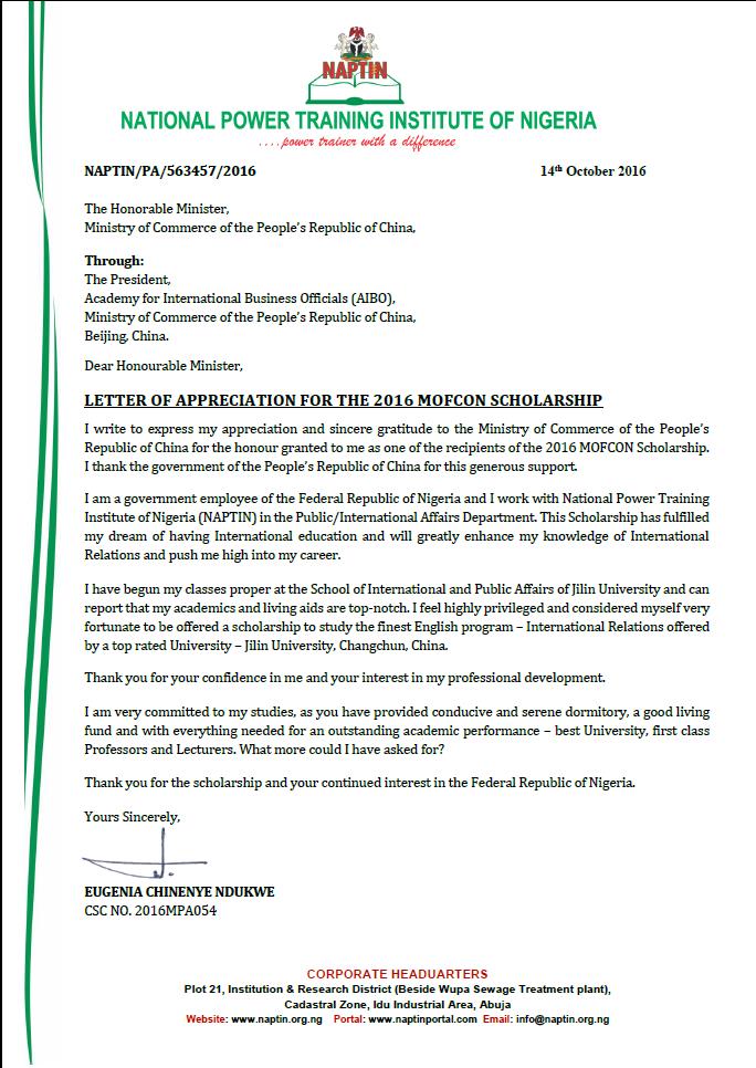 近日,在公司国际关系专业学习的商务部援外学历学位项目尼日利亚籍硕士研究生Eugenia Chinenye Ndukwe,向商务部发出感谢信,感谢我国政府提供的奖学金机会帮助她完成留学梦想,感谢公司为学员提供一流的教学条件和生活环境。在信中,她表示自己很幸运能够来到HAHA体育学习国际关系专业,并将努力取得优异的学习成绩。