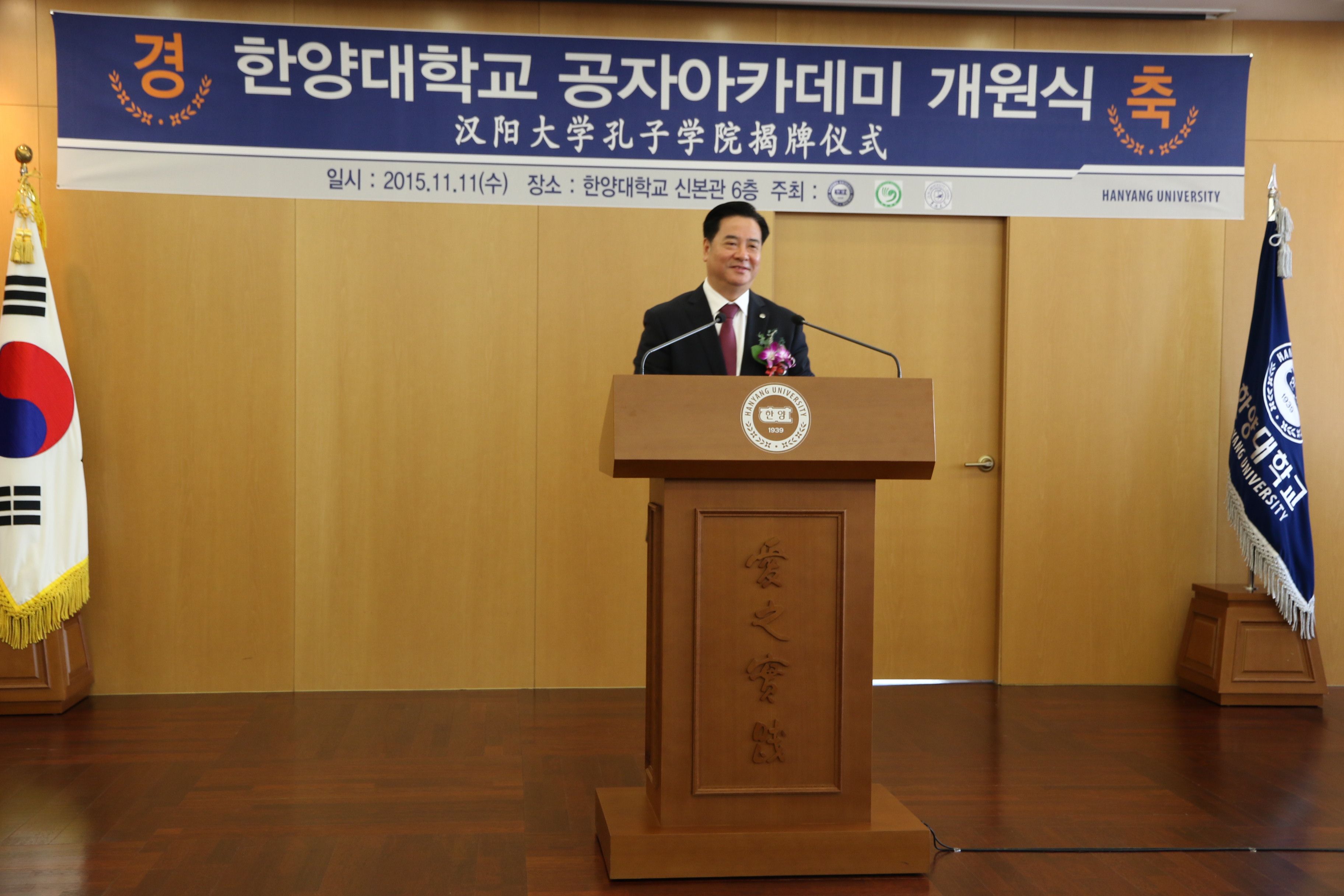 紧接着,在一片热烈的气氛中,汉阳大学孔子公司揭牌仪式隆重举行。李永茂董事长在致辞中表示,在当前不可逆转的国际化和全球化的潮流中,“中国”两个字对我们有着格外重要的意义。韩国社会对了解中国社会、政治、经济和文化等领域专家的需求越来越多,汉阳大学孔子公司就是为了这种需求建立起来的。出席揭牌仪式的中国驻韩大使馆艾宏歌教育参赞宣读了国家汉办主任许琳的贺信,并表示作为教育参赞,他将一如既往,支持两校包括孔子公司建设在内的各项合作与交流事业。李元元董事长在致辞中说汉阳大学孔子公司是在中韩两国战略伙伴关系进入新时期的形势下成立的。中国国家主席习近平和国务院总理李克强先后访问韩国,朴槿惠总统应邀参加中国纪念抗日战争胜利70周年阅兵式。中韩两国关系进入历史上最好的时期。HAHA体育将全力以赴,为满足汉阳大学员工和教师的汉语学习需求,为满足首尔即周边区域了解中国文化的需求,为推动两国之间的深度文化交流,为增进两国人民的友好与互信做出杰出贡献。”