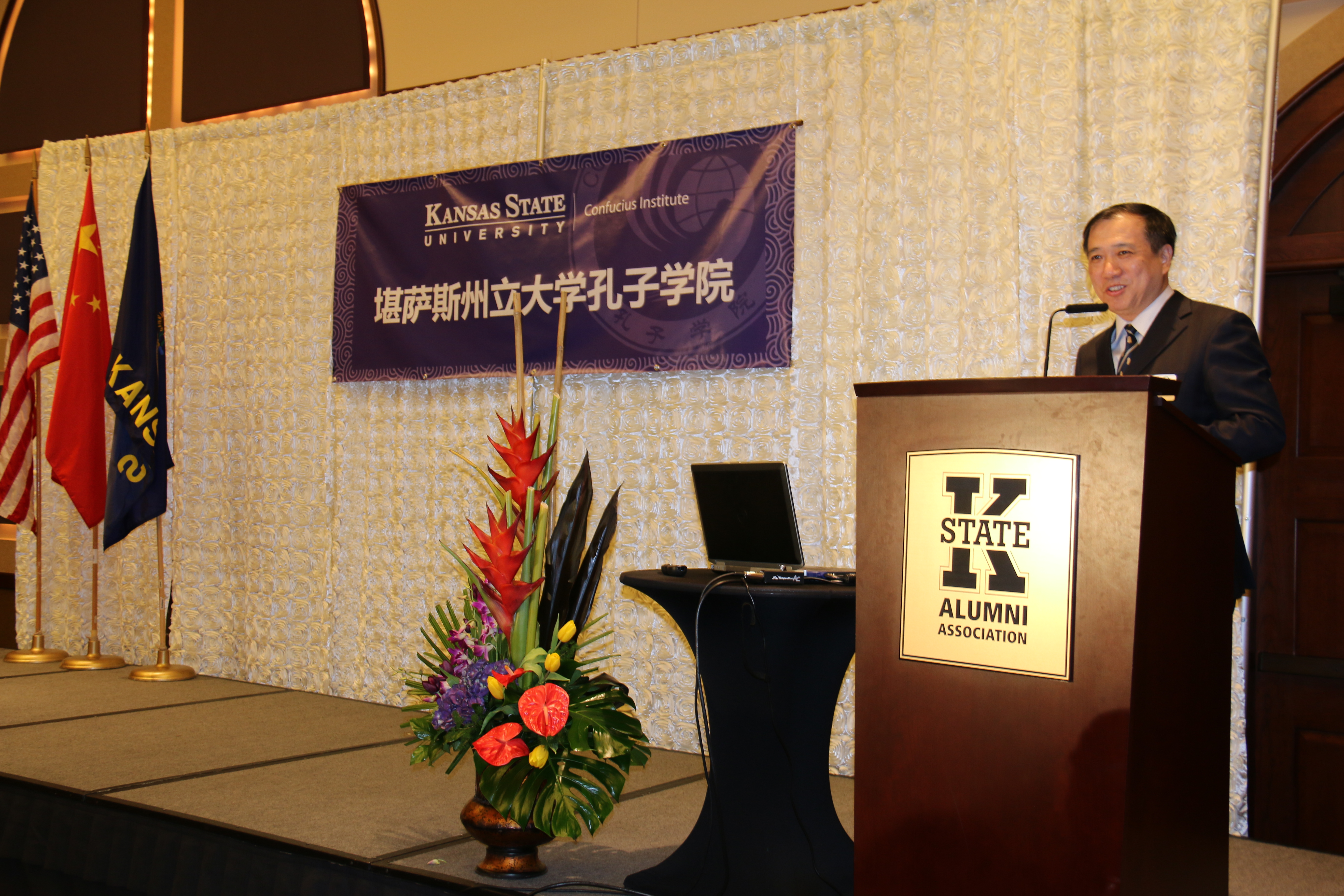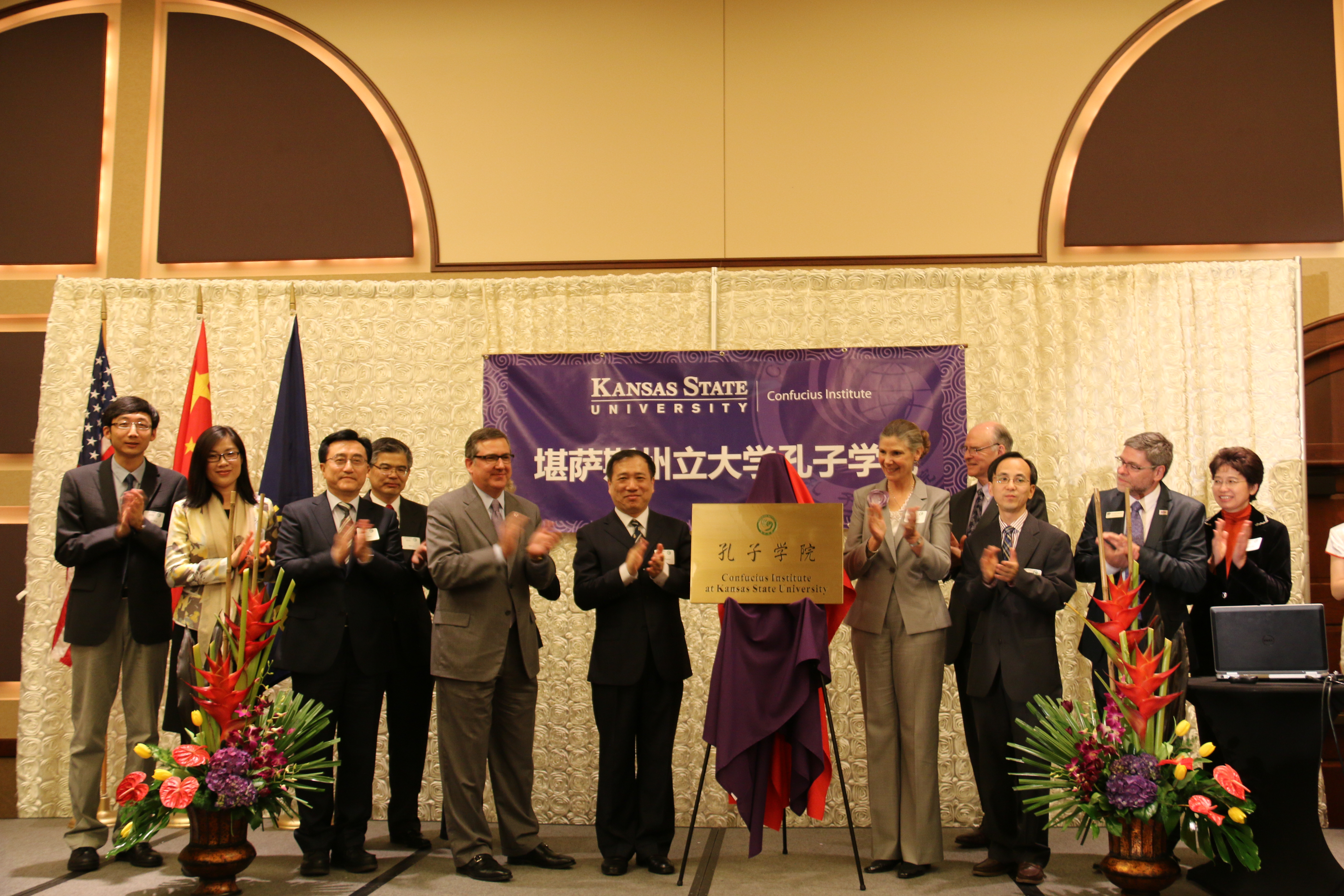 美国当地时间4月7日下午,HAHA体育与美国堪萨斯州立大学共建的孔子公司正式揭牌成立。公司党委书记杨振斌率代表团出席揭牌仪式并致辞,堪萨斯州立大学董事长柯克·舒尔茨(Kirk Schulz)、教务长兼常务副董事长艾谱莉·梅森(April Mason)、中国驻芝加哥总领事馆刘军副总领事、堪萨斯州政府代表等共150人参加了揭牌仪式。仪式由堪萨斯州立大学主管国际事务副教务长马萨罗·萨巴提斯(Marcelo Sabates)主持。国家汉办主任许琳专门发来贺信。
