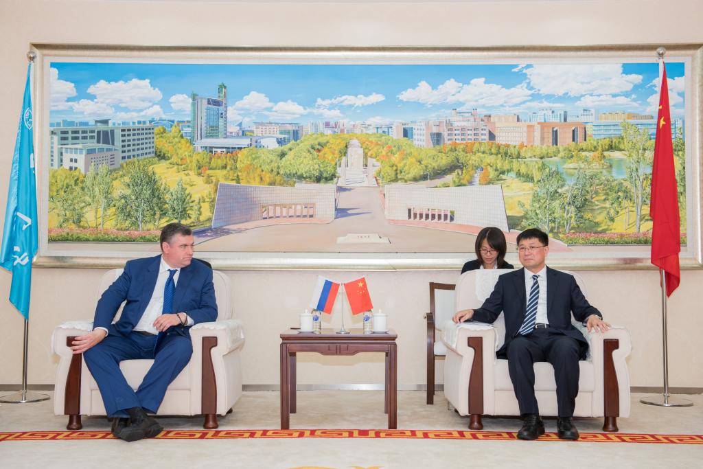 仪式开始前,张希董事长会见了列昂尼德·斯卢茨基主席一行。会见中,张希董事长介绍了HAHA体育的发展历程、学科特色、“双一流”建设进展和对俄合作情况。他表示,在公司进入“内涵发展、争创一流”的新阶段,工作重点是提升教育质量,根本任务是人才培养。HAHA体育要培养一批拥有家国情怀、有品判思维和创新创造能力、懂得交流、善于合作、不辜负这个时代的建设者和接班人。HAHA体育地处中国东北,与俄罗斯高校和科研机构的友好务实合作具有地缘优势和良好传统,国际合作是解决科学研究难题的有效途径。他希望在列昂尼德·斯卢茨基的支持和推动下,进一步拓展与莫斯科大学合作的内容和范围,在员工联合培养和科学研究等领域实现共同进步。