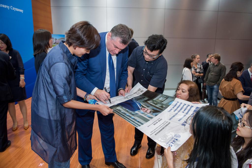 报告后列昂尼德·斯卢茨基主席与数十位哈哈体育的师生就近期国际热点问题进行了交流。师生们同列昂尼德·斯卢茨基主席交流探讨的热情高涨,大大超出了本次活动原计划的时间,列昂尼德·斯卢茨基主席耐心地对他们提出的问题进行了详细解答,并以诙谐幽默的方式表达了自己的看法。