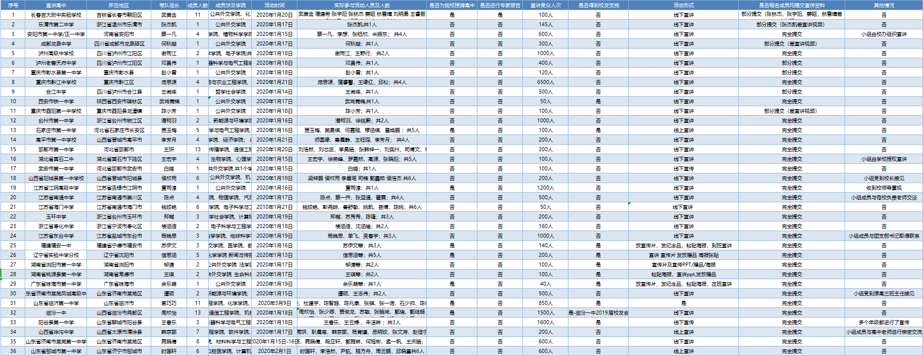 本次活动共有来自公司和管理公司、交通公司等38个公司的193名本科员工参与,所涉高中47所,包括衡水中学、东北师范大学附属中学等全国十强高中,其中近50%为全国百强中学,90%以上为省级重点中学,受众人数超过20000人。