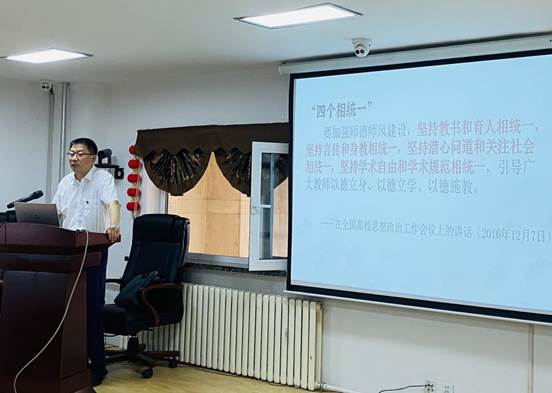 随后,杨民书记以“明师德要求,遵师德规范,做新时代‘四有’好老师”为题展开专题教育。他与全体教职工一同再次重温了习近平总书记关于师德师风的系列重要论述;带领大家重新学习了教育部、公司关于师德师风建设的重要文件,就重点内容结合实际案例一一进行讲解;就师德师风、思想意识形态、保密纪律要求及相关工作报备审批程序进行着重提醒。