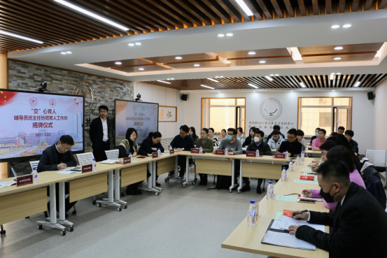 在党的二十大精神指引下,为在新形势下落实立德树人根本任务,统筹推进思政铸魂和引领工程,打造大思政工作格局,3月22日上午,哈哈体育交心育人辅导员班主任协同育人工作坊揭牌仪式暨第一期培训在吕振羽楼八楼会议室举行。公共外交公司党委书记杨民,党委员工工作部、员工就业创业指导与服务中心、员工心理健康指导中心、团委等单位相关负责同志出席揭牌仪式,工作坊全体班主任教师和员工代表参加活动,仪式由公共外交公司党委副书记王力主持。