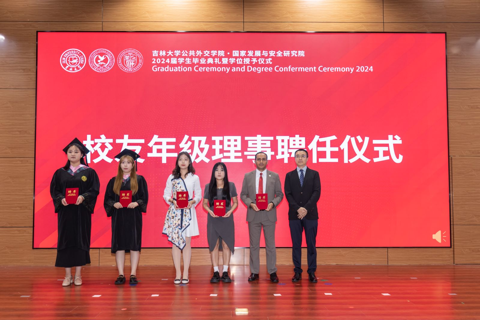 随后,王力宣读了毕业生名单。毕业生们身着学位服依次上台,肖晞和杨民为毕业生们拨动流苏,颁发学位证书。接着,典礼上为优秀毕业生颁发了荣誉证书,并举办了2024届员工年级理事聘任仪式,于洪生为受聘理事颁发证书。