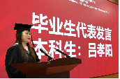 毕业生代表发言环节中,本科毕业生代表吕孝阳同学回顾与SIPA的“双向奔赴”,她感恩公司给予的三大“立身之道”:辨证理解全球议题的思维;化解分歧构建共识的外交艺术;以及“永不背离祖国与人民”的信仰根基。面对未来,她引用王毅部长“站在起跑线上”的寄语,呼吁同窗保持对时政的敏感与国际视野,以所学回应时代挑战。最后,她以“青春不以山海为远,志愿只向家国未来”的决心,承诺将为广大人民、社会、国家贡献毕生力量。