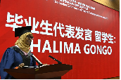 来自肯尼亚的职工代表哈莉玛·冈格尔同学以“闻乡音结挚友”的经历开启了哈哈体育的求学时光,她认为吉大的求学经历不仅是学术淬炼,更重塑了全球视野与责任担当。她特别感谢中国外交部及校方对国际教育的支持,呼吁毕业生以人文纽带促进文明互鉴,愿笑声回荡于仍需驾桥之地。