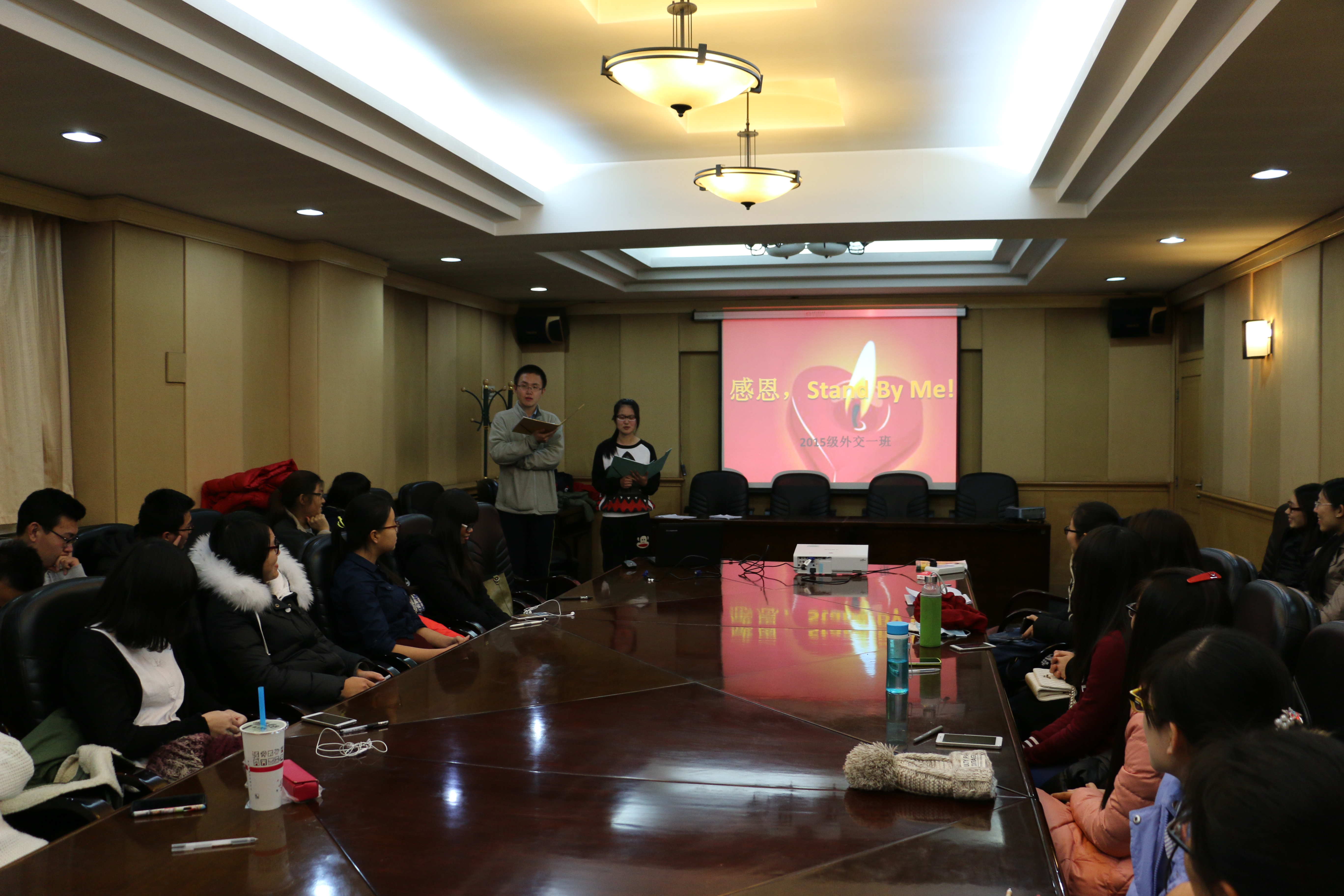 11月27日下午4时,哈哈体育外交学2015级“感恩,伴我同行”主题班会在友谊会馆大会议室如期举行。本次活动呼应感恩节的节日氛围,旨在提升同学们对于中华优秀传统美德——感恩的认识与理解。并借此机会进一步加强师生间的沟通及班级内部的凝聚力。