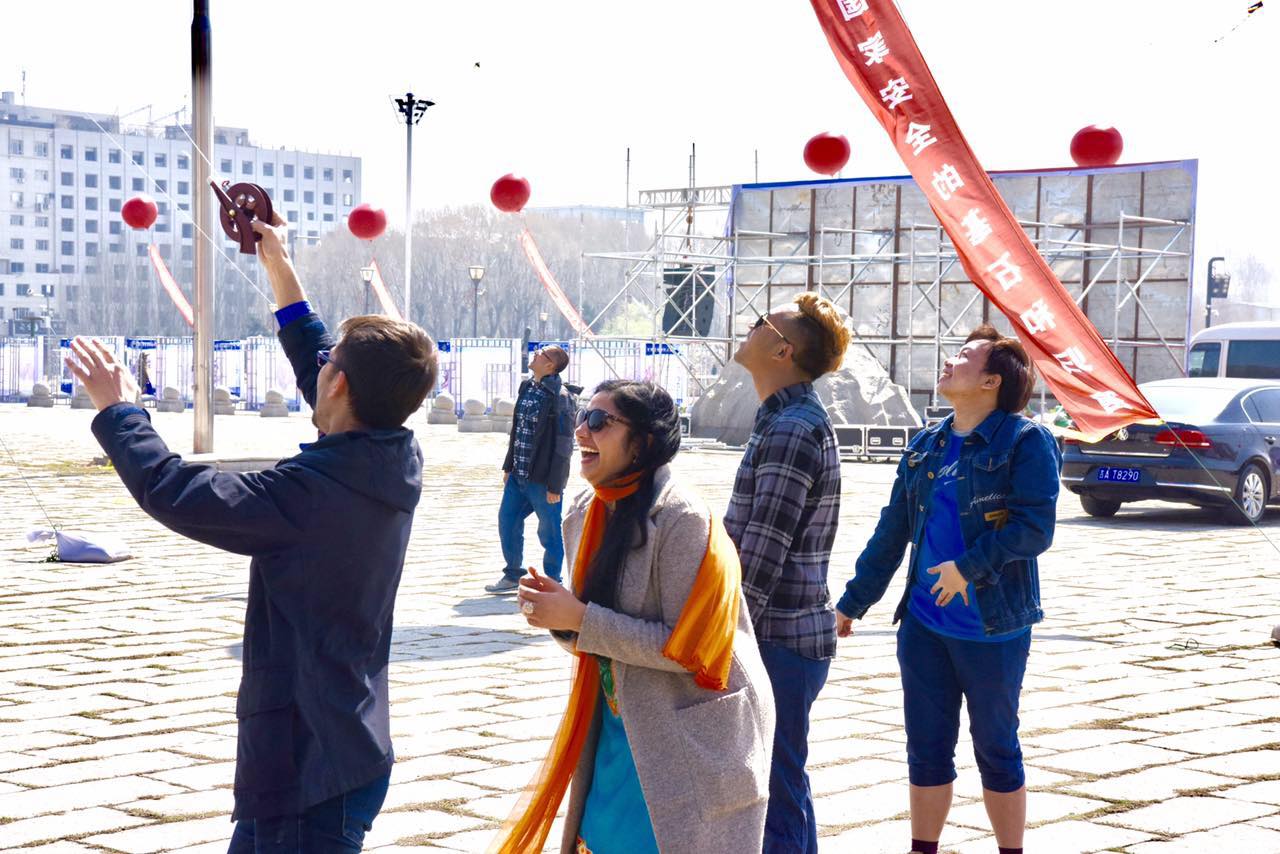 早上,参加活动的中外员工从中心校区乘坐大巴前往文化广场。从朝阳校区步行到文化广场的过程中,员工们被地质宫特色的建筑和校园内春色所吸引,纷纷驻足拍照。来到广场后,在同学们的互相帮助下,很快一个个五颜六色的风筝升上了天空。对于职工们来说,这个有2000多年历史的“新事物”,带给了他们很大的新奇感和快乐。望着飞翔在天空的风筝,很多同学都露出了孩童般真挚的笑容。