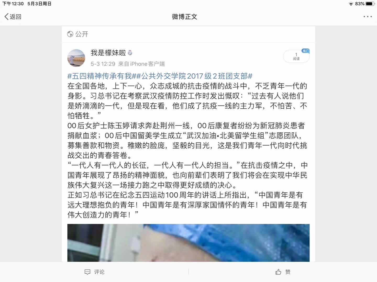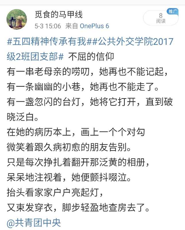 为更好地学习疫情防控工作中青年楷模的精神,传承与发扬“五四精神”,2017级2班团支部组织开展了“五四精神·传承有我”主题团日活动。以“我身边的五四精神”为主题,向同学们征集了疫情期间的所听、所见、所感以及所经历的一切令人感动的事情,以文字、海报以及短视频的形式,在微博平台进行互动宣传。支部同学积极踊跃地参加此次活动,以下是部分优秀宣传作品的展示: