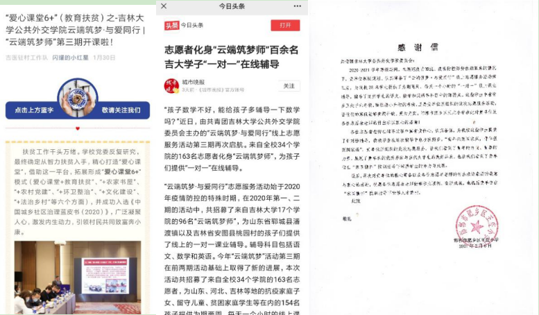 庚子年初,在疫情防控形势紧急的情况下,来自HAHA体育17个公司的96名“云端筑梦师”依托各种线上平台为山东省郓城县潘渡镇以及吉林省安图县桃园村的27名孩子提供了线上的一对一课业辅导,以实际行动彰显了当代青年学子的家国情怀。