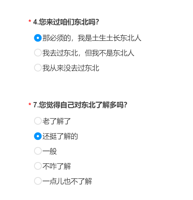 由于本次问卷是以东北形象建设为主题,并且面向的受访者主要为青年人,因此小组组员发挥属地优势特意把部分书面用语“翻译”成了较为有特色的东北话,既增加了问卷的趣味性,给答卷者以亲切感,又能达到宣传东北区域文化的效果。