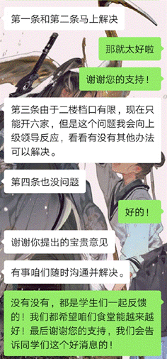 根据问卷结果,莘子园食堂的问题集中在菜品种类、质量以及食堂管理等方面。工作人员联系了同学们的好朋友——张哥反馈意见,张哥表示乐意听取同学们的意见,并会加以改进,努力为同学们营造更舒适的用餐环境。