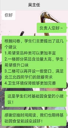 根据问卷同学们对基础园食堂的几类建议如下:希望菜品种类可以更加丰富;一楼部分菜品过于油腻,希望提升口感;二楼可以增设窗口,满足北三北四同学们的就餐需求;希望改善卫生环境。工作人员联系了食堂负责人吴主任,并立刻得到了回复。吴主任表示大部分问题都可以解决,但增设窗口问题仍需和领导协商。