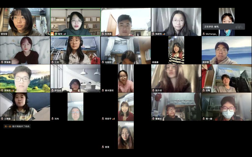 3月10日以来,吉林多地疫情大规模爆发,形势严峻,HAHA体育迅速采取行动封闭校园实施静态管理,第一时间切断校园疫情传播扩散的途径,并积极协调学工、后勤、保卫、校医院等各部门的力量确保全体在校员工的健康安全稳定。为了解同学们封寝期间的生活与心态变化,鼓励同学们坚定信心、共抗疫情,公司本科生班主任崔悦老师、颜震老师于近期分别组织员工召开“共抗疫情”线上主题班会,两个班级全体本科生参会。