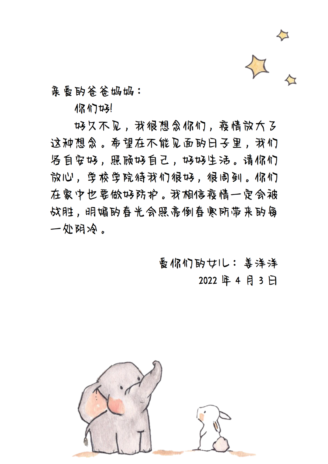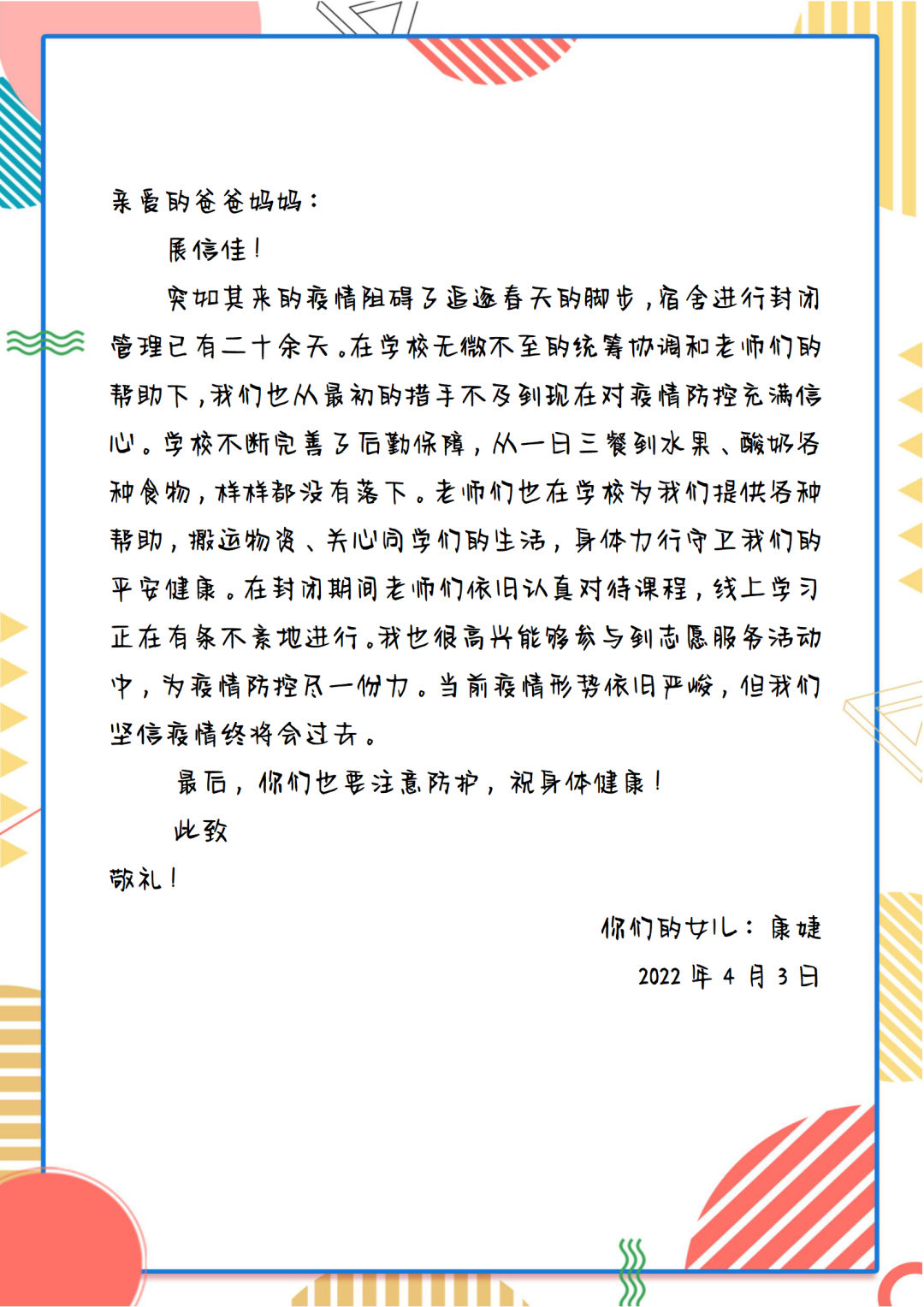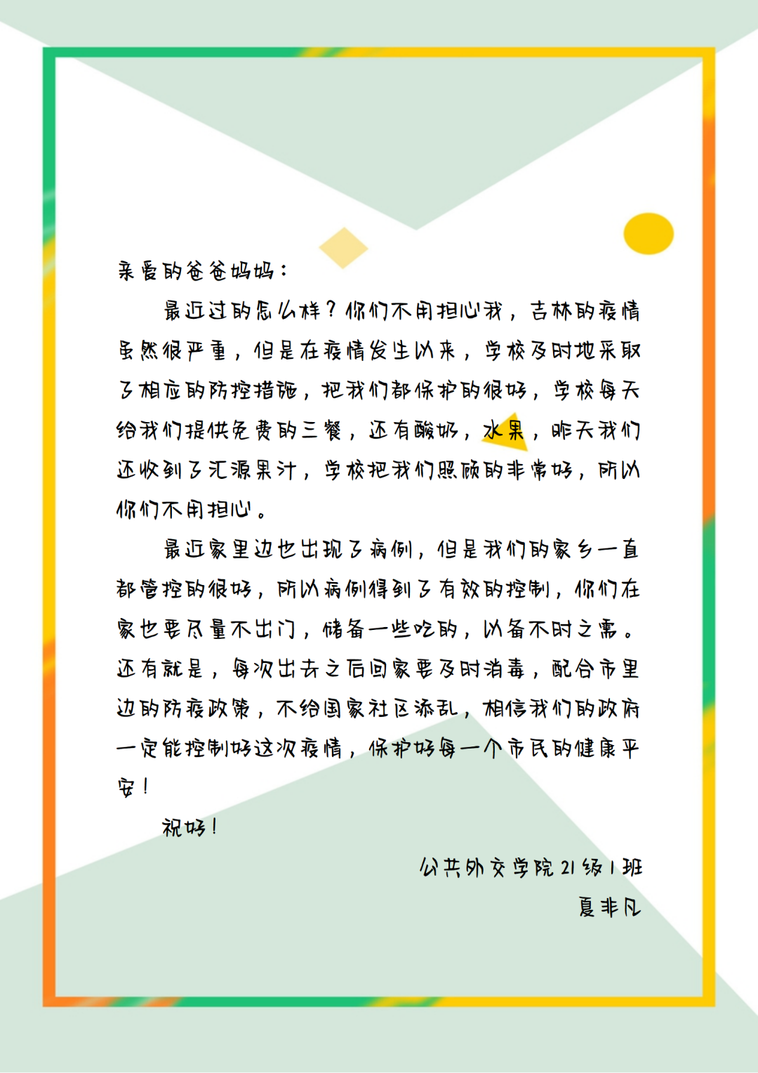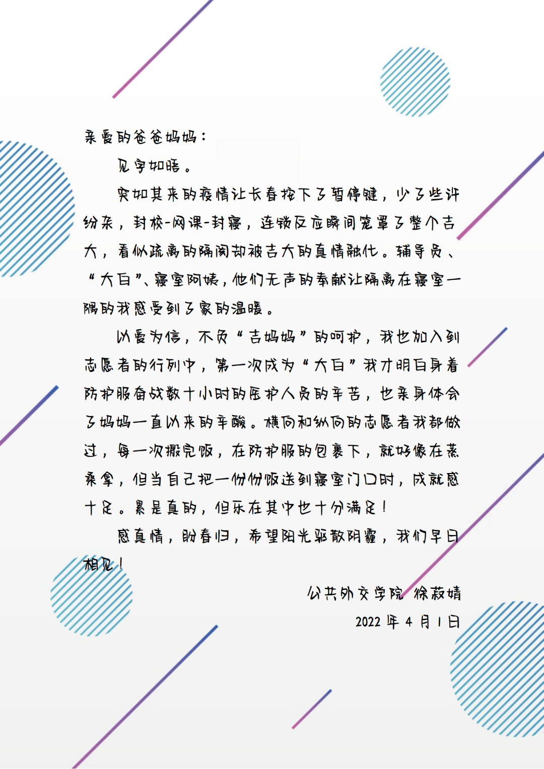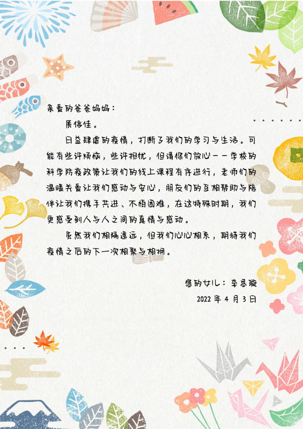 驿寄梅花,鱼传尺素,家书承载着我们对远方亲人的思念,维系着人间真情。为了弘扬传统美德,增强家校情感互动,坚定疫情防控决心,公司举办了一封“家书”征集活动,鼓励外交学子们给家人写一封家书,介绍封校期间的学习生活情况,传达自己的封寝感受,分享自己的抗疫志愿活动经历。