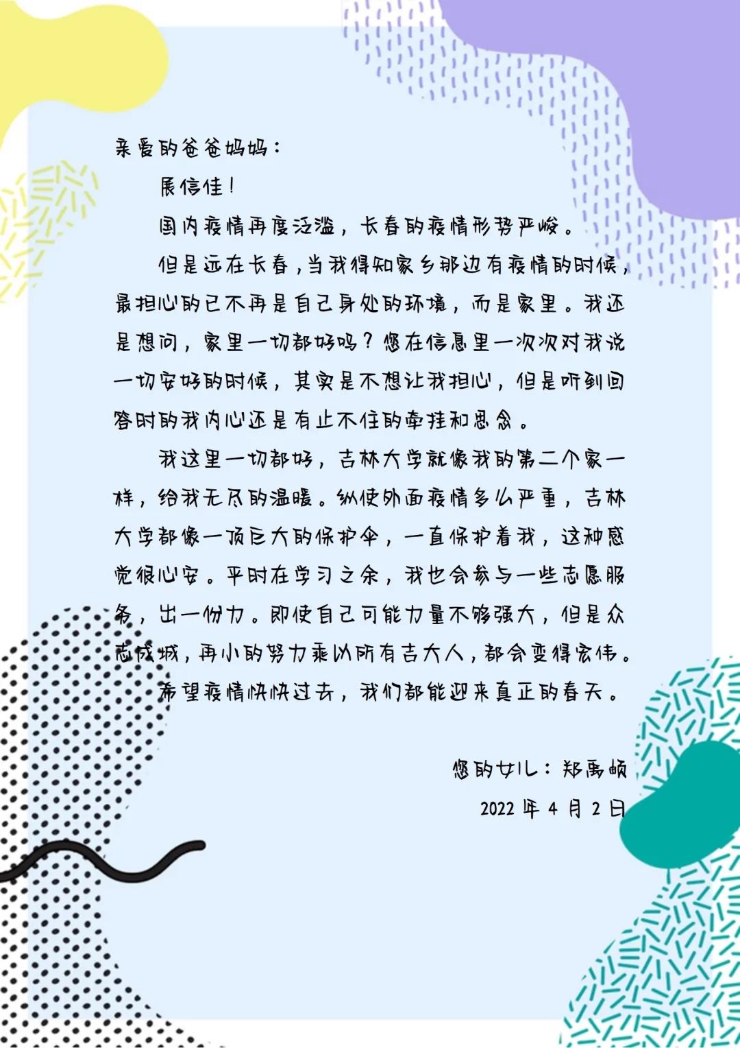 突如其来的疫情给大家正常的学习生活按下了暂停键,在封校的二十多天里,在与吉大同呼吸、共命运的二十多天里,在与老师、同学们一同抗击疫情的二十多天里,无数的思念与牵挂深埋心中,一个个情真意切的字眼,一封封绵绵真情的家书,承载着学子们赤诚的情意。我们也相信,当远方挂念着家中儿女的亲人们收到这些信的时候,心情一定是激动的、安心的。
