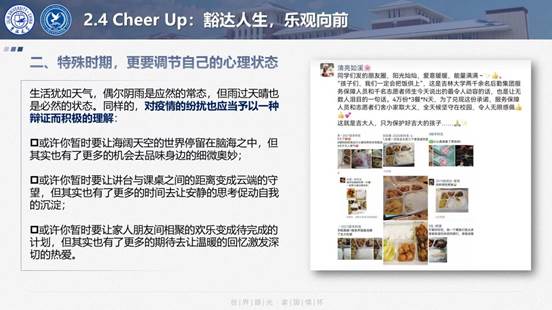 肖晞老师希望新生能“Cheer Up”,期盼员工们能够在脚踏实地的基础上志存高远,并对经历的一切困难都可以做到“宠辱不惊,去留无意”,以乐观心态创造豁达人生。她指出,进入大学面对一个新的环境时,学会调节自己的心理状态至关重要。建议同学们迷茫时读书,烦躁时运动,独处时思考。尤其是在疫情防控这段特殊时期中,更是要学会调整自己的心态。“世事无常,而爱恒常”,她鼓励同学们要乐观面对学习与生活,以高昂的姿态直面人生挑战。同时她强调,养成良好的生活习惯也至关重要。在疫情防控依然任重道远的情况下,同学们更应当注重自我身体健康,平时注意保持整洁的生活环境,饮食方面也应做到健康有规律,要以强健的体魄促进精神的强大。