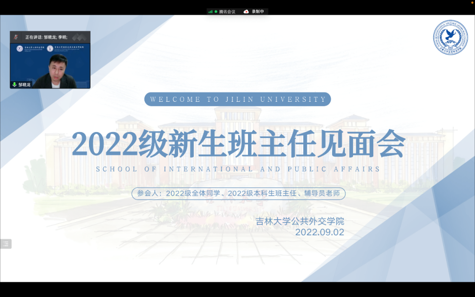 本次线上新生班主任见面会不仅为班主任和新生的沟通交流搭建桥梁,同时,班主任老师们为新生大学学习生活规划提供了行之有效的建议,为新生们系好了在吉大哈哈体育的第一颗纽扣。相信各位2022级的外交学子在老师们的陪伴下定能踔厉奋发,笃行不怠,努力成为具有“世界眼光•家国情怀“的SIPA人。