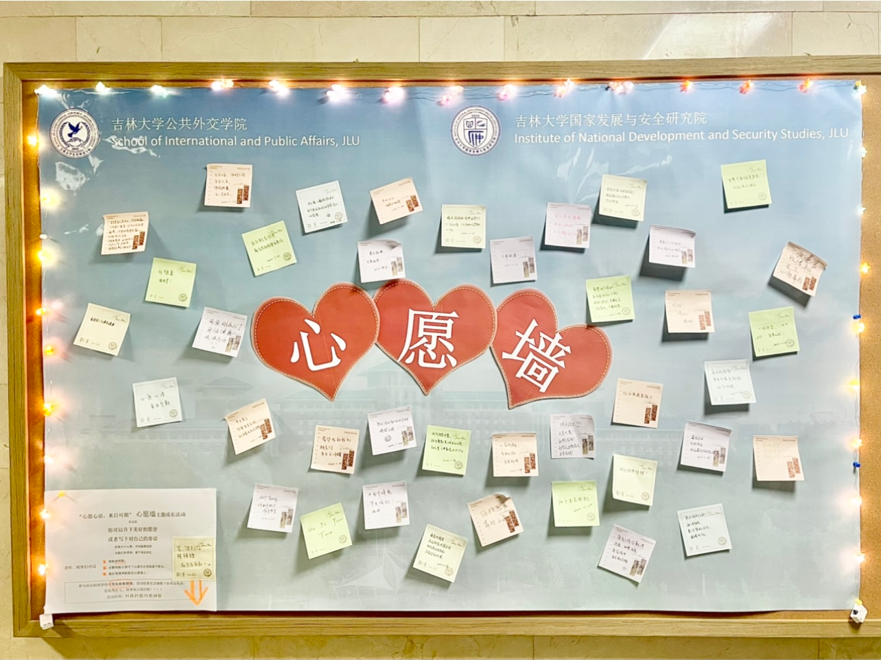 活动期间,同学们在便利贴上写下自己的心愿和对朋友的祝福,老师们也在心愿墙上写下了对同学们美好未来的展望。心愿墙很快便被各种各样美好的心愿填满,有人希望家人身体健康,朋友永远在身边;有人希望自己学业有成,去往更高的地方;有人希望能走遍大江南北尝遍各种美食;还有人希望拥有一段甜甜的恋爱等等。一个个愿望在心愿墙上闪闪发光,满载着哈哈体育、国家发展与安全研究院全体师生对未来生活的期许。