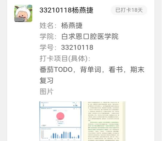 在这次打卡活动中我学到了很多。在这二十一天中,我参与了单词打卡,认识了许多新单词,加入了早起打卡 ,养成了每天早起的好习惯,更开发了不同的学习软件。这是一次难忘的学习活动,在群里,来自不同专业的同学们一起在坚持中体味努力学习与认真的乐趣。“知命不惧,日日自新”,这次活动让我感受到老员工活的意义,非常喜欢这次活动!