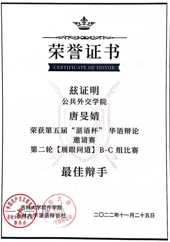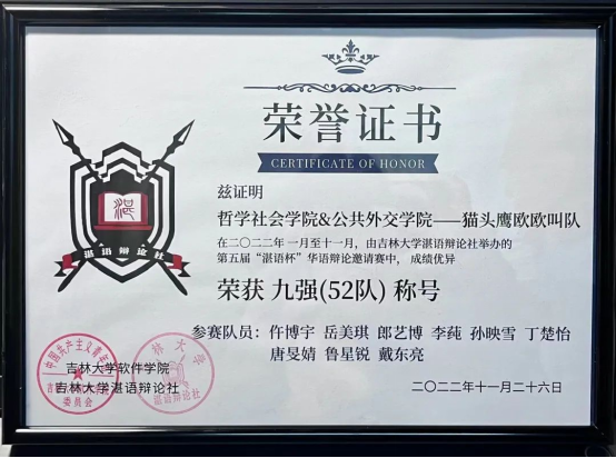 由SIPA辩论队和哲学社会公司组成的“猫头鹰欧欧叫队”取得了九强(52队)的成绩,由SIPA辩论队和计算机科学技术公司辩论队组成的联队也表现出色,其中唐旻婧同学表现优秀,获得了单场最佳辩手的荣誉称号。