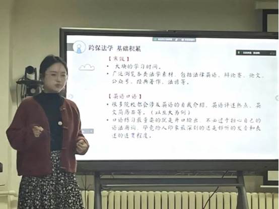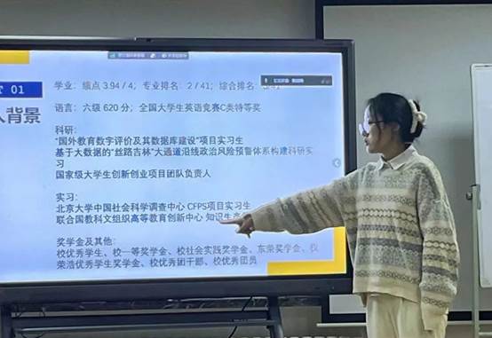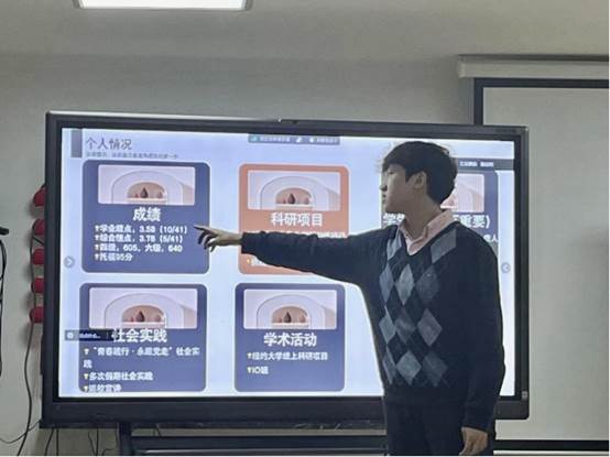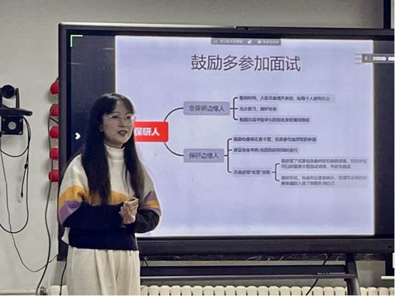 白雅婧同学向大家分享了自己的保研经验和心得体会,她从“个人背景”、“保研情况”、“申请经验”和“个人感悟”四个方面展开介绍,重点分享了前期准备和参与夏令营和预推免的全过程,结合自己的经验,强调了专业排名在保研中的重要性,她鼓励同学们多读书,积累专业知识,重视平时的综合成绩,在学习过程中探索兴趣,为未来职业的发展方向定位。最后,她希望同学们在应对压力大、难度大的面试时调整好心态,坦然接受结果,不断建构自我,锚定目标,做好准备。