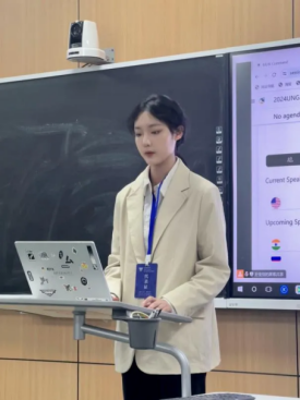 公司牛艺萱同学作为约旦代表,在联合国安理会会场中坚定维护国家利益,灵活运用和平外交的方式与各国代表积极沟通、协商、交流,同时寻找相似立场的国家或组织,发表联合声明,撰写工作文件、决议草案等,共同为维护伊拉克局势的稳定和和平贡献智慧。