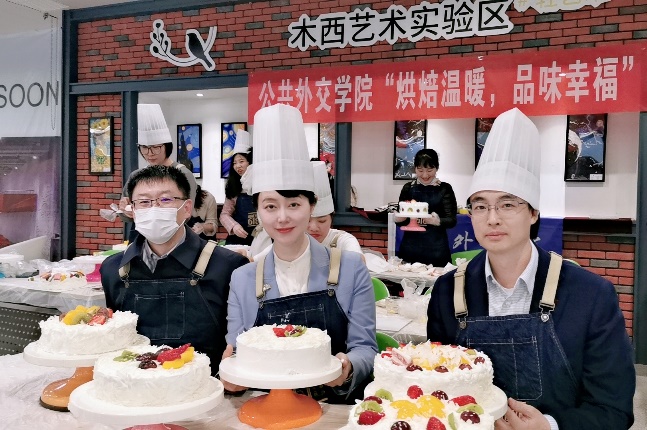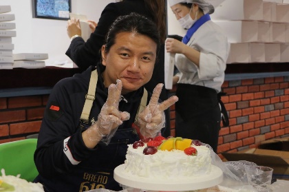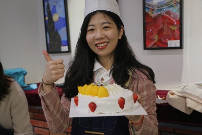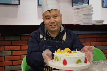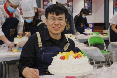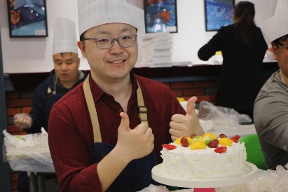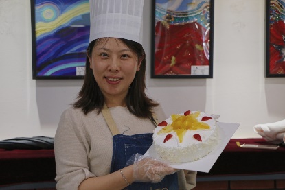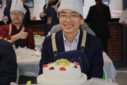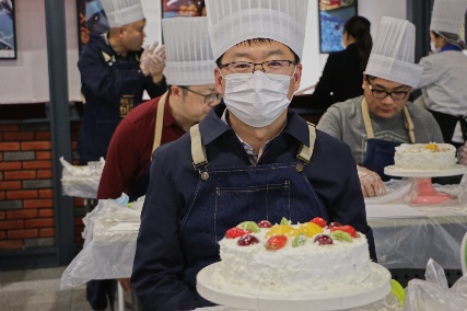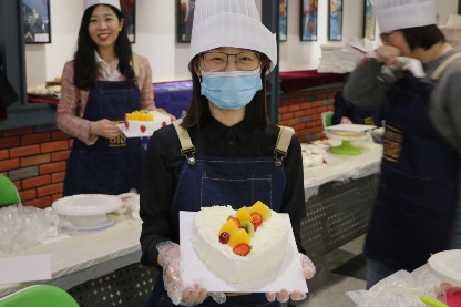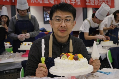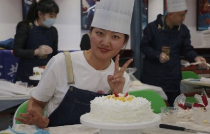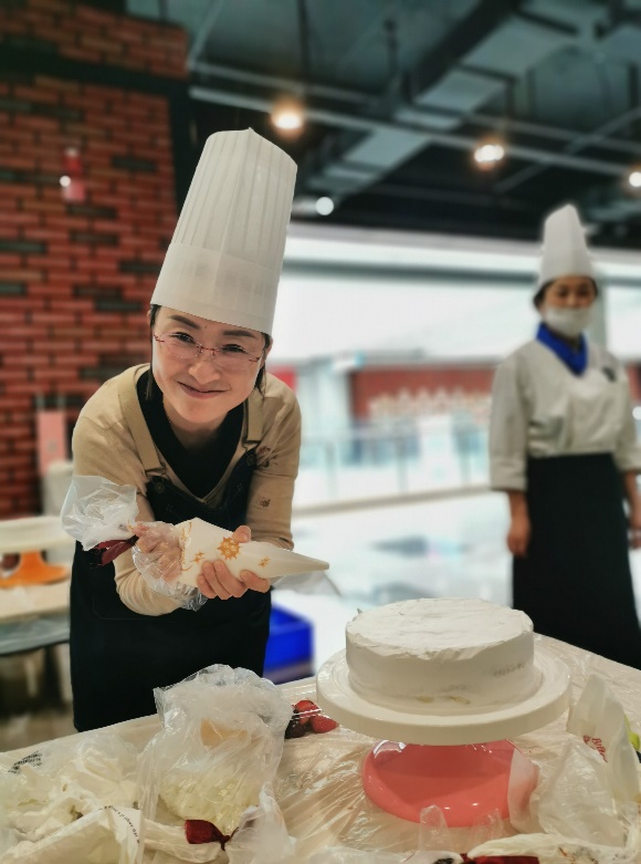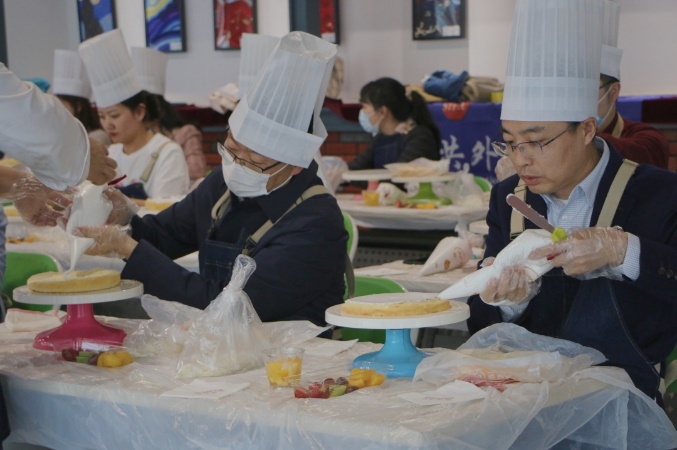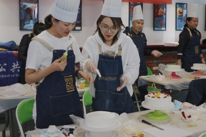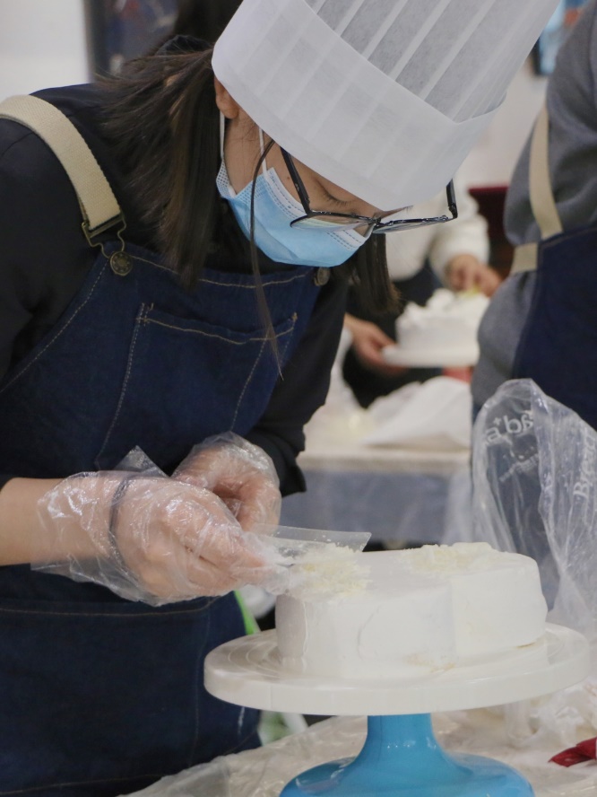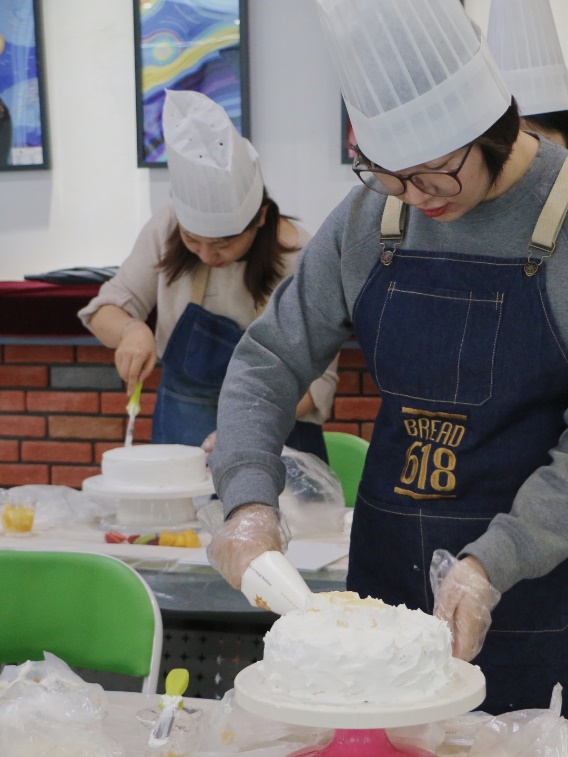 接着,老师们开始动手制作自己的奶油蛋糕。金黄的蛋糕坯、洁白的甜奶油、新鲜的水果……老师们在烘焙师的指导下精心制作,释放紧张工作压力的同时,也在蛋糕上展现着自己的奇思妙想。