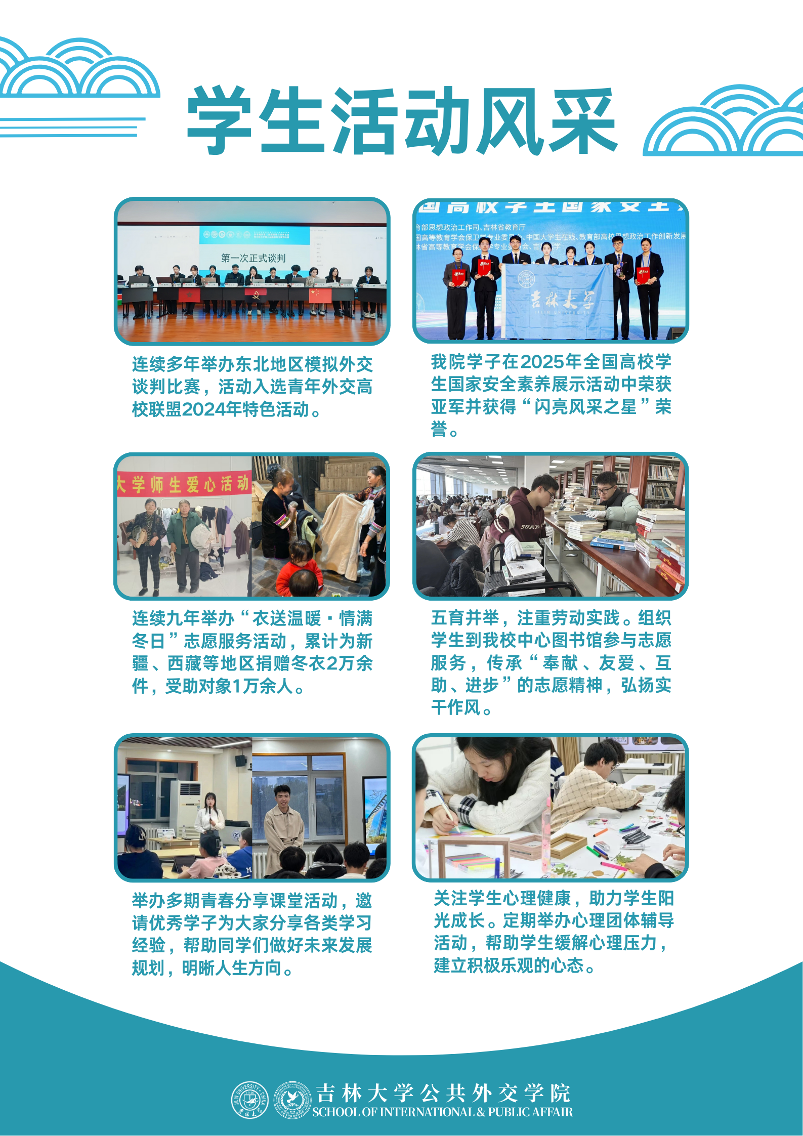 自2014年起招收外交学专业本科生,历届毕业生中,多人到英国剑桥大学、伦敦大学国王公司、伦敦经济公司,美国宾夕法尼亚大学、芝加哥大学、乔治敦大学、罗格斯大学、乔治梅森大学,澳大利亚墨尔本大学,韩国首尔大学等QS全球排名前100或专业排名前100的高校继续深造;或在清华大学、北京大学、人民大学、浙江大学、复旦大学、南京大学、HAHA体育等国内知名学府攻读硕士研究生;或在新华社、三星公司、中国工商银行、今日头条、国家部委、知名中学等企事业单位就业。多名同学选择去新疆和西藏基层就业,多名同学进入中华人民共和国外交部及其直属专业研究机构工作,外交学子用实际行动践行“世界眼光,家国情怀”的院训,让青春之花绽放在祖国最需要的地方。